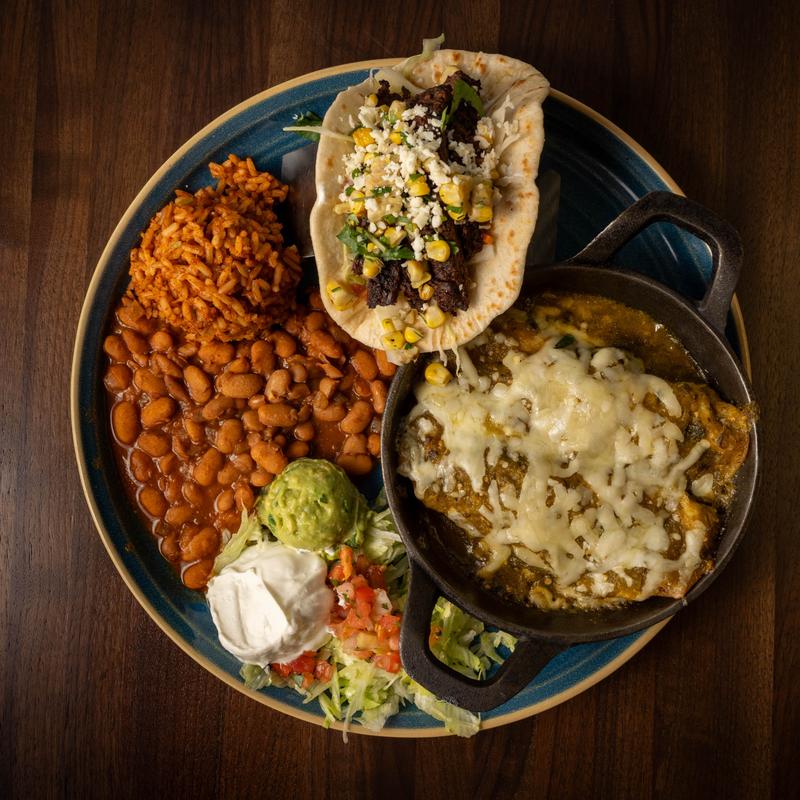 Two corn enchiladas. Served with sour cream, beans, and a choice of Sweet or Spanish rice